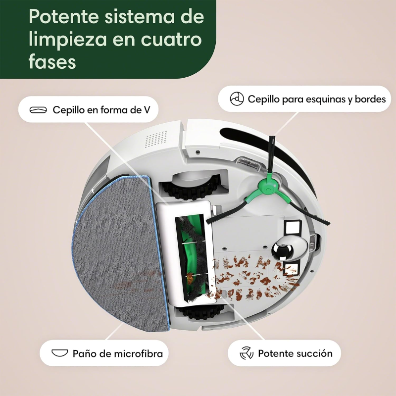 El Robot Aspirador iRobot Roomba Combo Essential cuenta con un sistema de navegación que utiliza tecnología de sensores para detectar objetos y paredes. Este robot incorpora un sistema de limpieza con dos modos: aspiración y fregado. Posee un depósito de suciedad de fácil acceso y un sistema de filtración que retiene partículas pequeñas. Su batería recargable permite un funcionamiento continuo durante un periodo determinado. El dispositivo es compatible con la aplicación móvil para programar y controlar las tareas de limpieza a distancia. Además, cuenta con indicadores LED que informan sobre el estado del aparato. Los materiales utilizados en su construcción son plástico y componentes eléctricos que cumplen con normativas de seguridad. El aspirador se puede programar para operar en horarios específicos y dispone de un sistema de recarga automática.